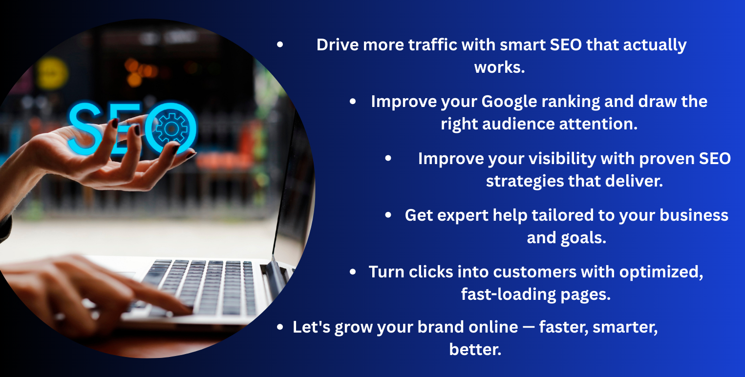SEO (Search Engine Optimization) helps your website appear on top when people search online. It’s all about using smart strategies—like keywords, fast loading speed, mobile-friendly design, and valuable content—to make your business more visible. SEO brings in the right audience without paid ads, making your growth sustainable and cost-effective. Think of it as making your website easier to find and more trustworthy for both search engines and real people. Better SEO means more clicks, more leads, and more success.